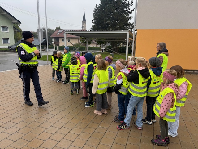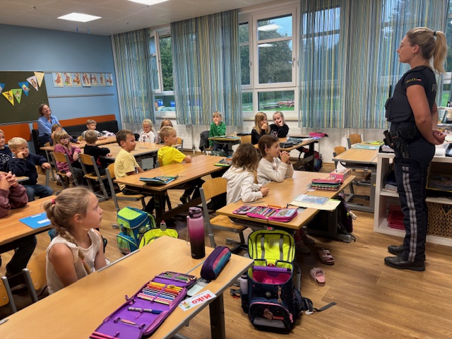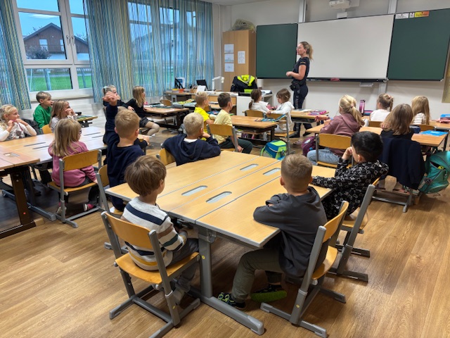 Ende September bekamen die 1. und 2. Klasse wieder Besuch von der Polizei. Es wurde sehr ausführlich besprochen, wie man sich auf der Straße richtig verhält.