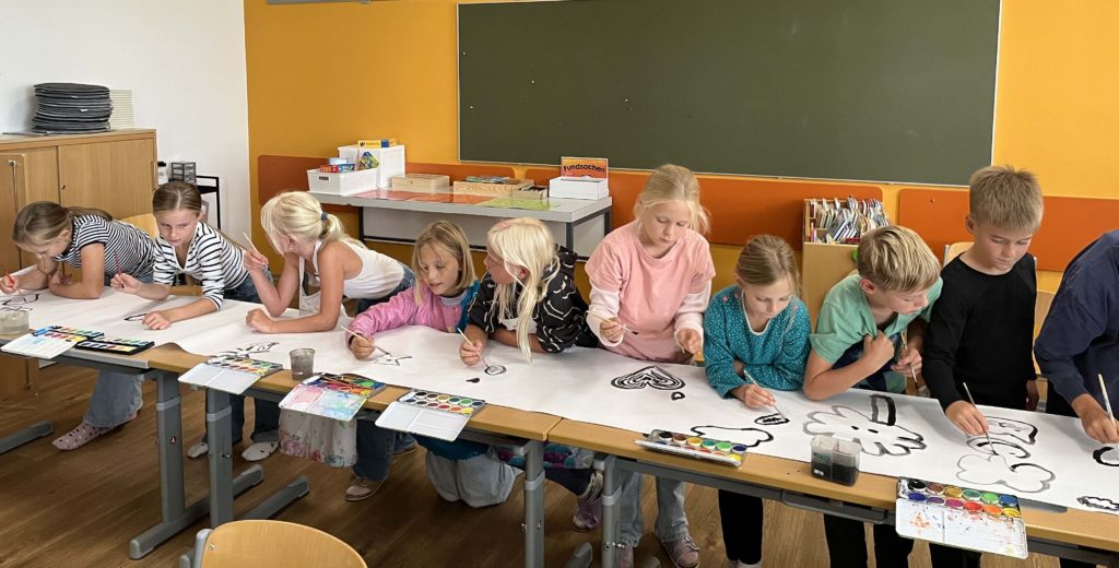 Auch in den Pausen zeigen die Kinder, wie kreativ sie sind;Großes Gemeinschaftsbild der 3. Klasse im Zeichenunterricht;Vogelhäuschen und Insektenhäuser der 4. Klasse für den Schulgarten (von der Gemeinde gesponsert)Die 3. Klasse arbeitet an der Kulisse für das Schulfest.Upcyceling-HasenSchlüsselanhänger der 4. KlasseVerrückte Osternester/Osterküken der 4. KlasseDinosaurier der 4. KlasseFrühblüher 2. KlasseEinlinienbilder 4. KlasseFaschingsmasken 2. Klasse